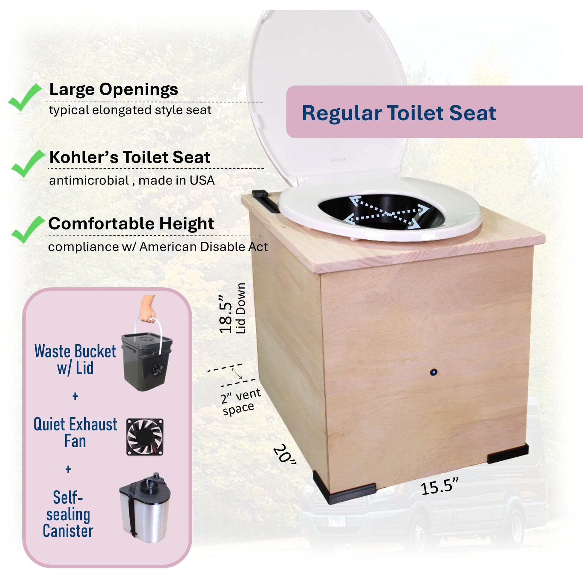 I've been using the compost toilet I recently purchased online, and I couldn't be happier with my choice! One of the standout features is the large opening, which makes it incredibly comfortable and convenient to use. The Kohler seat truly feels like home, providing the same comfort and familiarity as a traditional toilet seat while I was sitting in my Camper Van. Also, the fan helps the toilet odor-free. Cleaning was easy, I can lift the container from the box. I certainly recommend this product who needs comfort and cleaniness when you are on the road.
